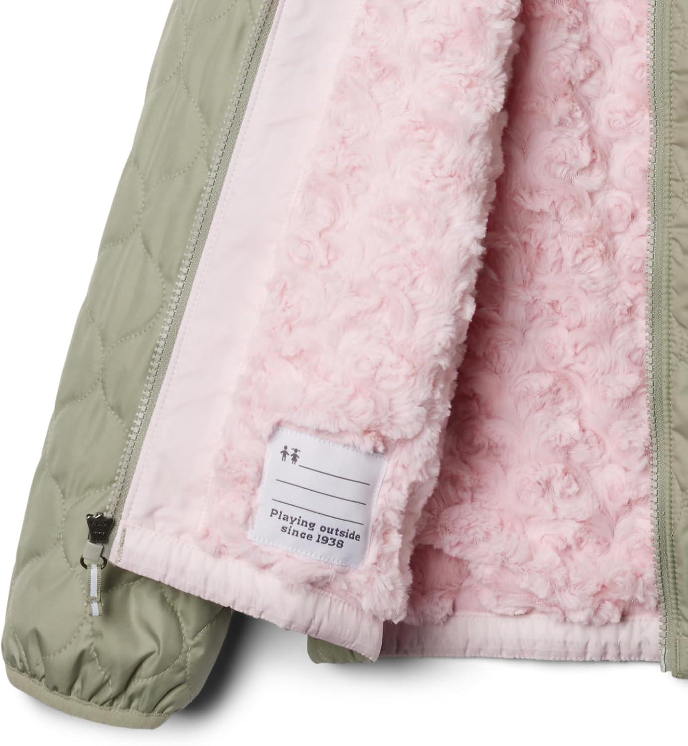A plush fleece lining adds extra comfort to this insulated, water-resistant Columbia girls’ jacket. The zippered pockets hold onto gloves, while binding at the cuffs and hem help keep out cold. Columbia offers this jacket in multiple colors and sizes. Regular fit.