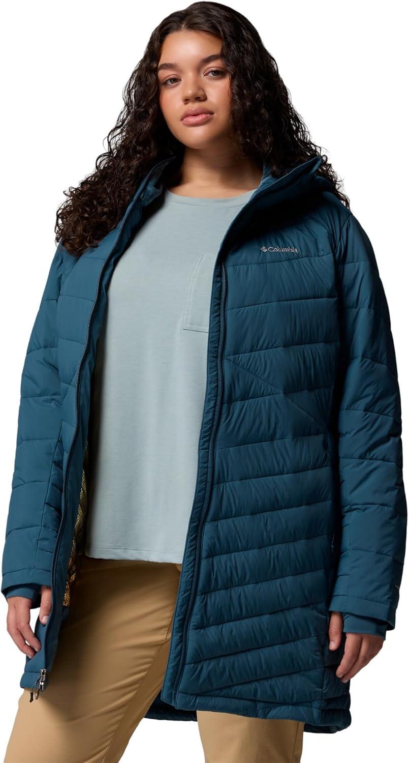 A just-right layer for town and trail, this Columbia women’s jacket offers a cozy fleece-lined hood and collar, recycled synthetic insulation, and a thermal-reflective gold lining that helps hold heat. The water-resistant exterior has a subtle sheen for a luxe look. Columbia offers this jacket in multiple colors and sizes. Extended sizing available. Active fit.