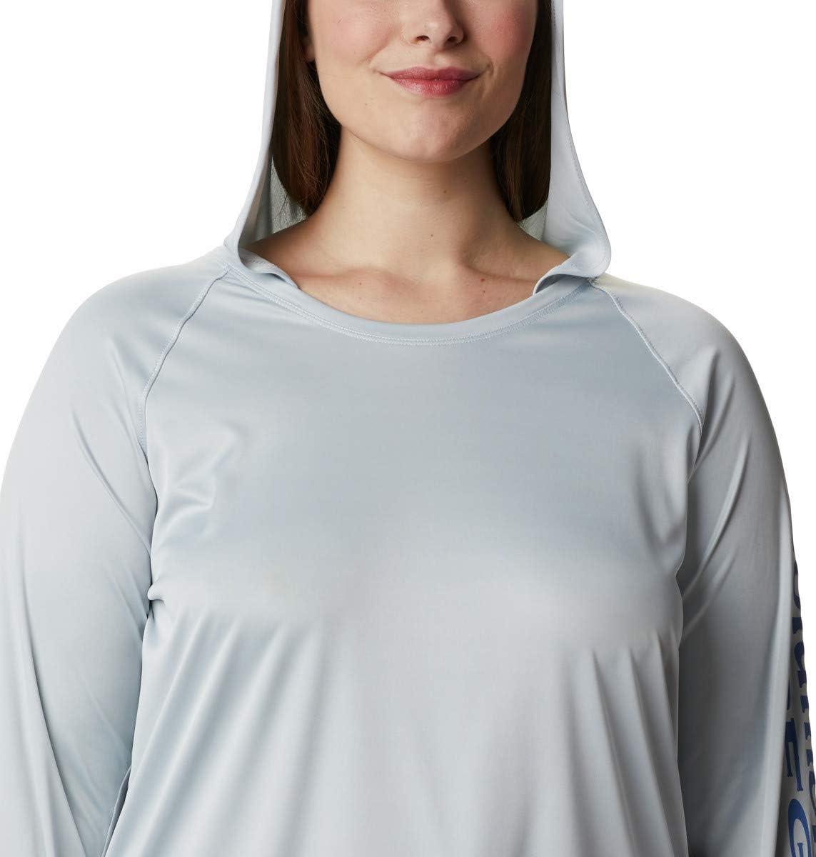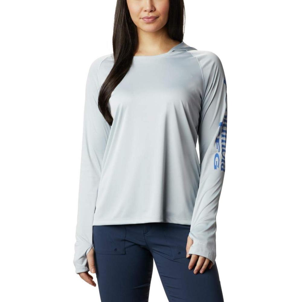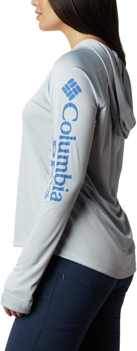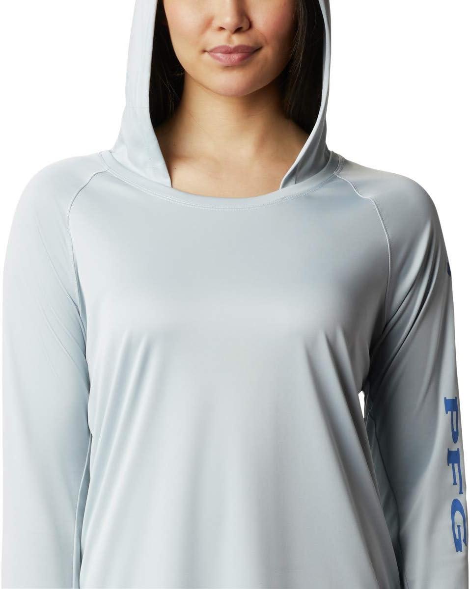 Columbia Women’s PFG Tidal Tee Hoodie, UV Protection, Moisture-Wicking(Cirrus Grey/Stormy Blue Logo)