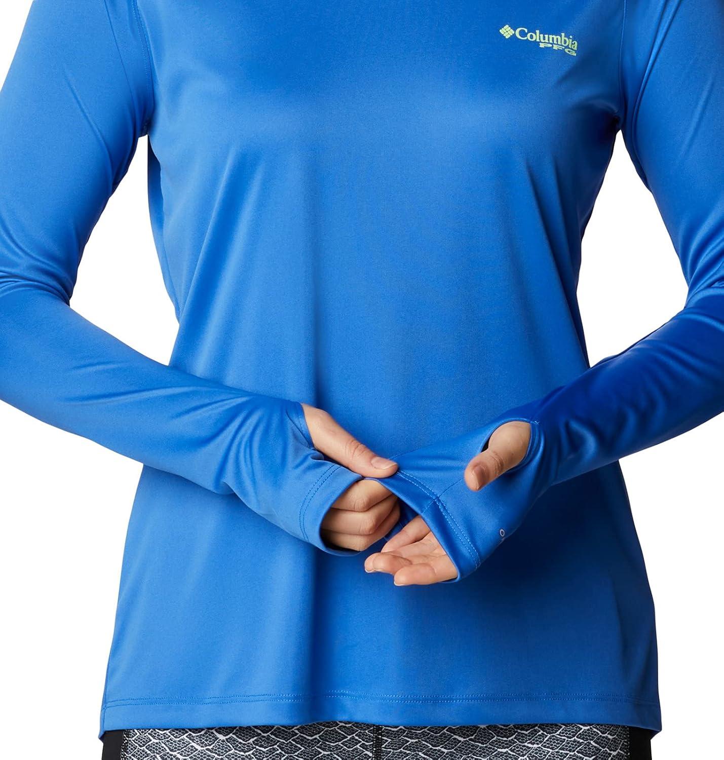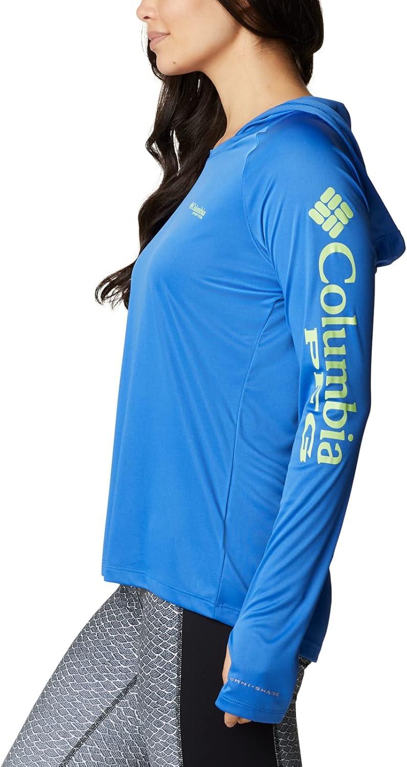 Columbia Women’s PFG Tidal Tee Hoodie, UV Protection, Moisture-Wicking(Vivid Blue/Lime Glow)