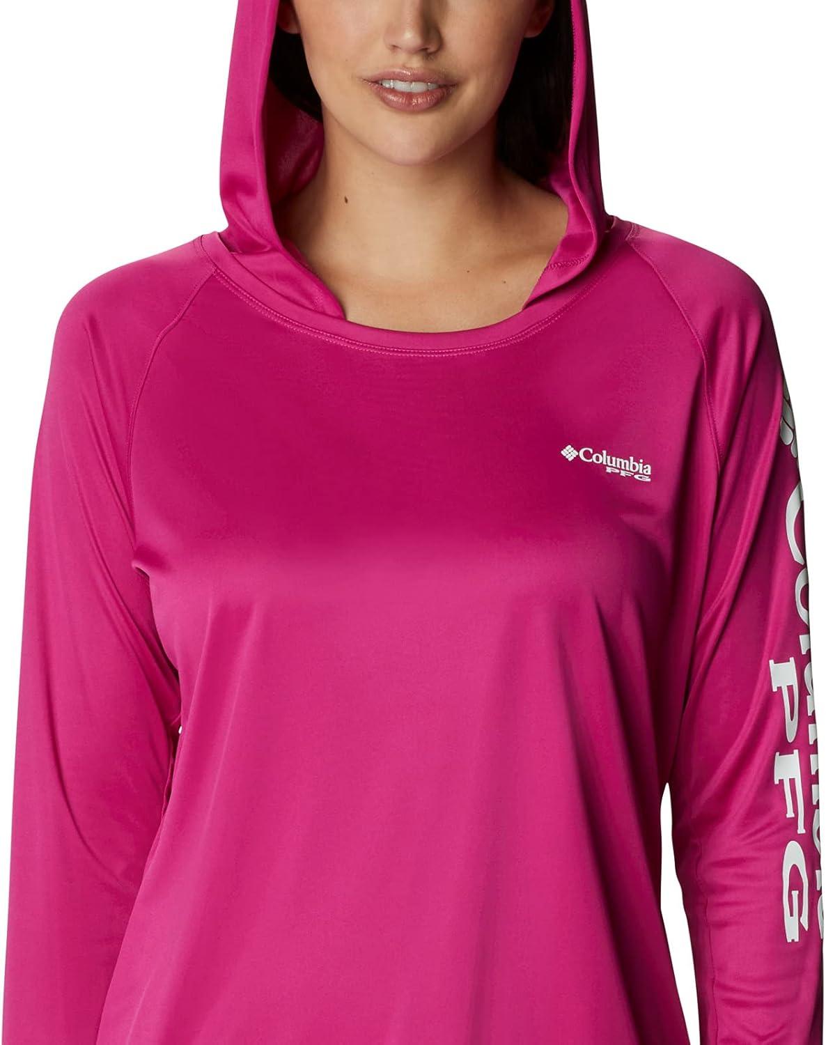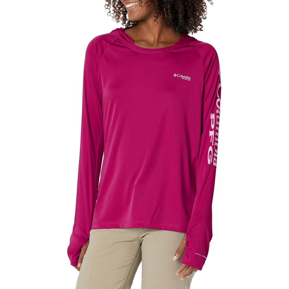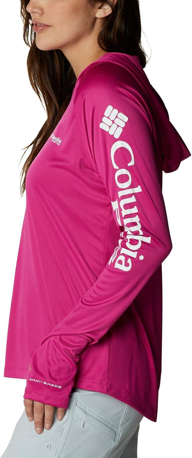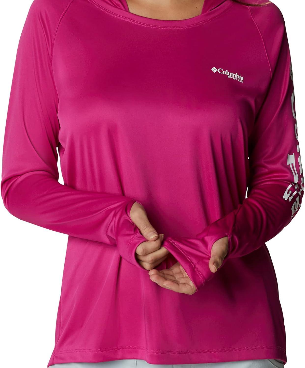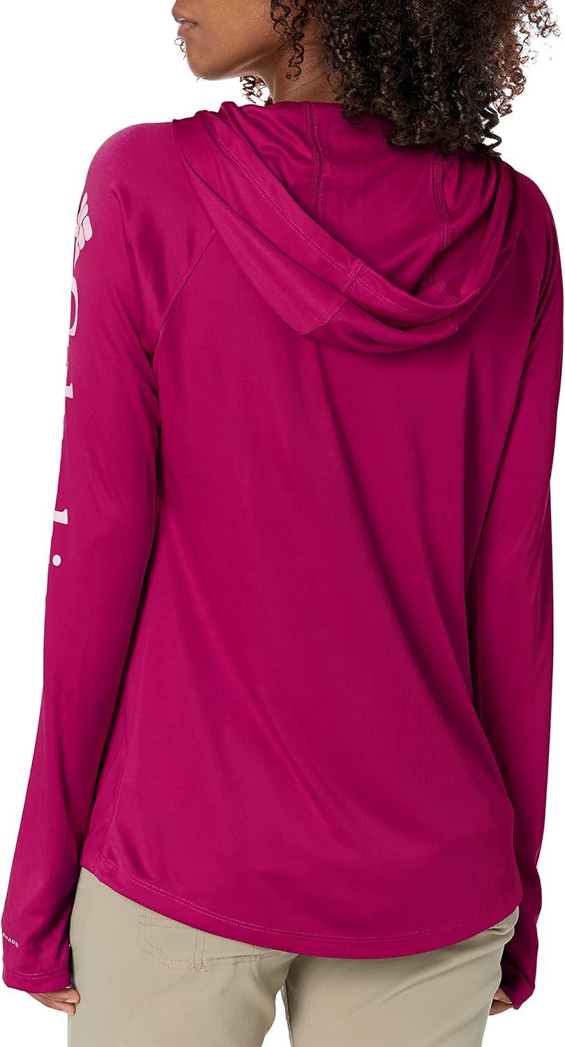 Fishing days just got better—Columbia PFG Women's Tidal Tee Hoodie has all the protection and comfort you need for your next big catch. Columbia is renowned for our quality material and proprietary technology featured in our women's apparel and this long sleeve shirt is an example of that. This long sleeve hoodie features our signature wicking fabric for ultimate moisture management during long fishing days. The unique technology quickly moves moisture from the skin into the fabric where it spreads across the surface to quickly evaporate—keeping you cool and your clothing dry and comfortable. The UPF 50 sun protection blocks UVA and UVB rays to help prevent sunburns and long-term skin damage. The tight weave construction with UV absorbent yarns block the full spectrum of harmful UV rays. The crew neck and all-way stretch fit make all-day wear and movement comfortable. Our signature logo is featured on the sleeve for subtle style. Whether you wear this layer alone or with other layers, you'll remain protected and comfortable out on the water. Columbia's Women's PFG Tidal Tee Hoodie comes in many sizes and colors. To ensure the size you choose is right, utilize our sizing chart and the following measurement instructions: For the sleeves, start at the center back of your neck and measure across the shoulder and down to the wrist. If you come up with a partial number, round up to the next even number. For the chest, measure at the fullest part of the chest, under the armpits and over the shoulder blades, keeping the tape measure firm and level.